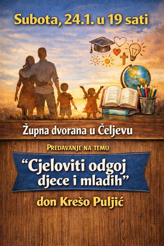 U subotu 24. siječnja 2026. godine sa početkom u 19:00 u župnoj dvorani u Čeljevu će biti održano predavanje:
